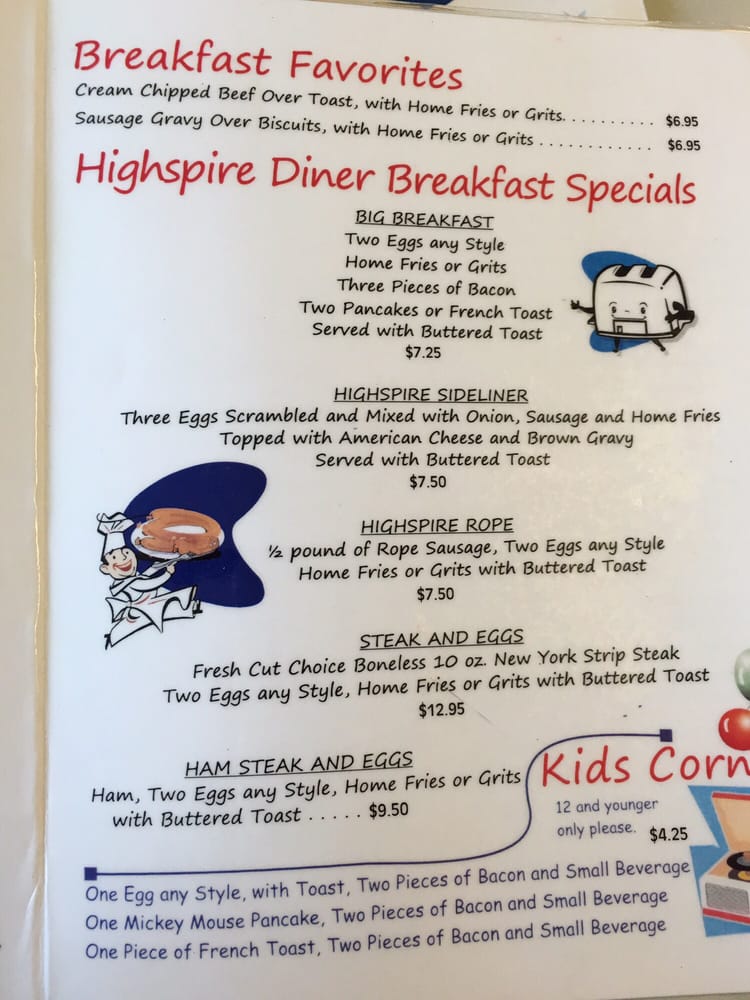 One standout feature of Highspire Diner is its dedication to providing quality food with many vegetarian options, ensuring that all guests can find something to enjoy. The homemade desserts, including Tapioca and Rice Pudding, are a must-try for those with a sweet tooth.